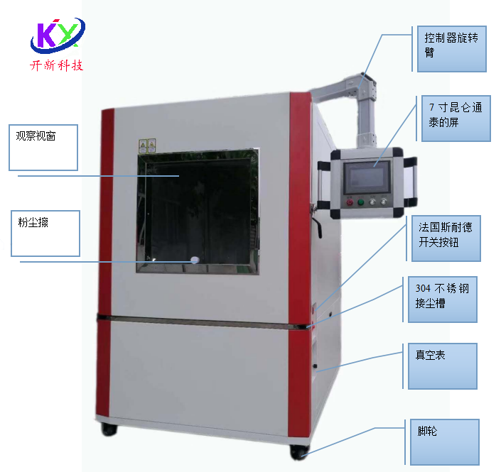 5. 基本结构:前处理箱、试验箱、吸尘口、集尘箱、循环吹尘装置、抽真空系统、尘储罐、流量阀、加热系统、倒流叶片、样品转盘、防护赛网、浓度计回尘管等组成。
