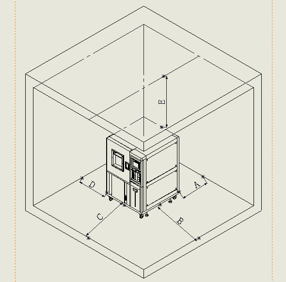 1.地面平整,通风良好 2.设备周围无强烈振动 3.设备周围无强电磁场影响 4.设备周围无易燃、易爆、腐蚀性物质和粉尘 5.设备周围留有适当的使用及维护空间,如下图所示: A:≥10cm B:≥30cm C:≥60cm D: ≥30cm E:≥40com |