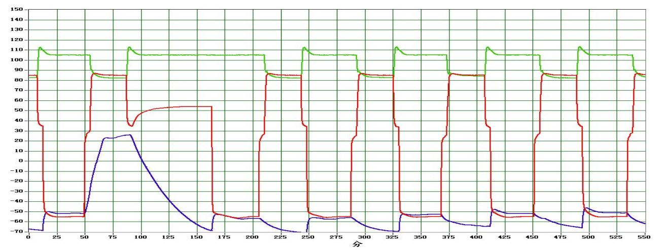 冲击过程(如图所示) 绿色为高温区储热曲线 , 红色为实验区冲击曲线 ,蓝色为低温区储冷曲线 |